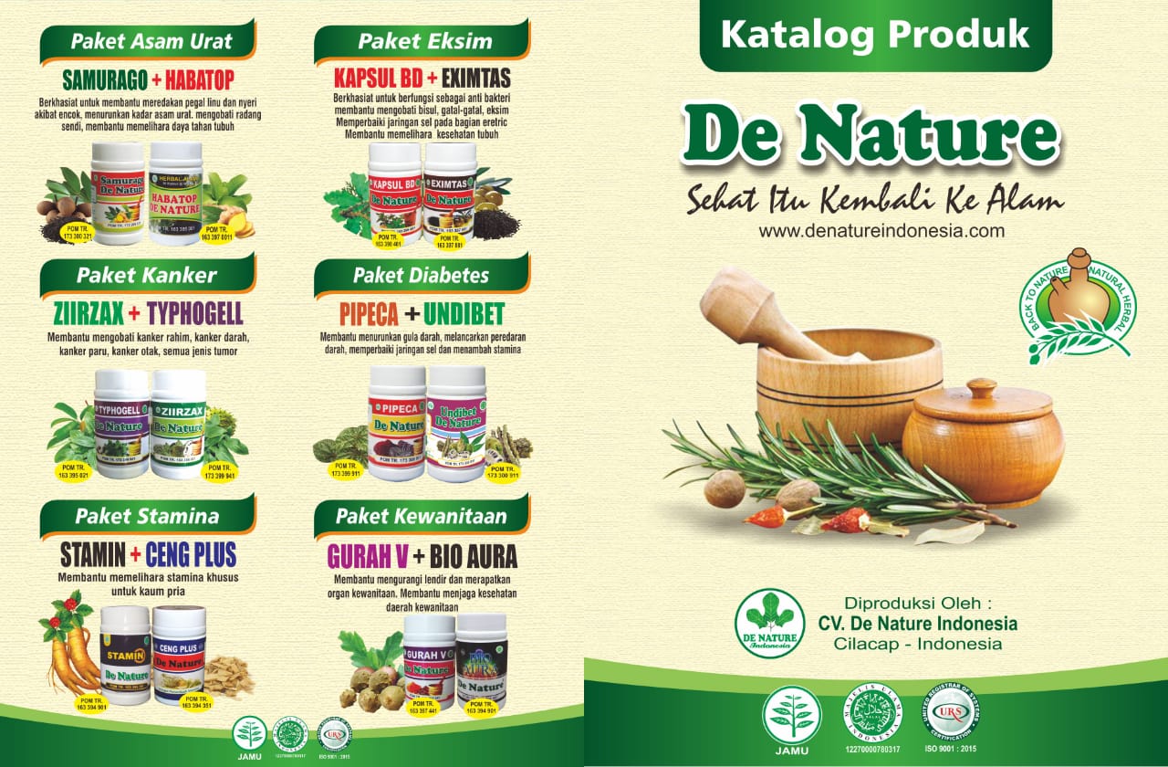 Berikut Produk yang kami jual adalah obat herbal bersertifikasi nasional ( ISO ), Dinas Kesehatan RI ( DIKES ), Majelis Ulama Indonesia ( MUI ), Badan Pengawas Obat dan Makanan ( BPOM ) dan mengikuti standar cara pembuatan obat tradisional yang baik ( CPOTB ), semuanya aman di konsumsi serta tanpa efek samping, dan dapat juga di gunakan bersama obat medis / dokter, Jika kita sedang melakukan terapi. Berikut daftar produk yang di jual De Nature :